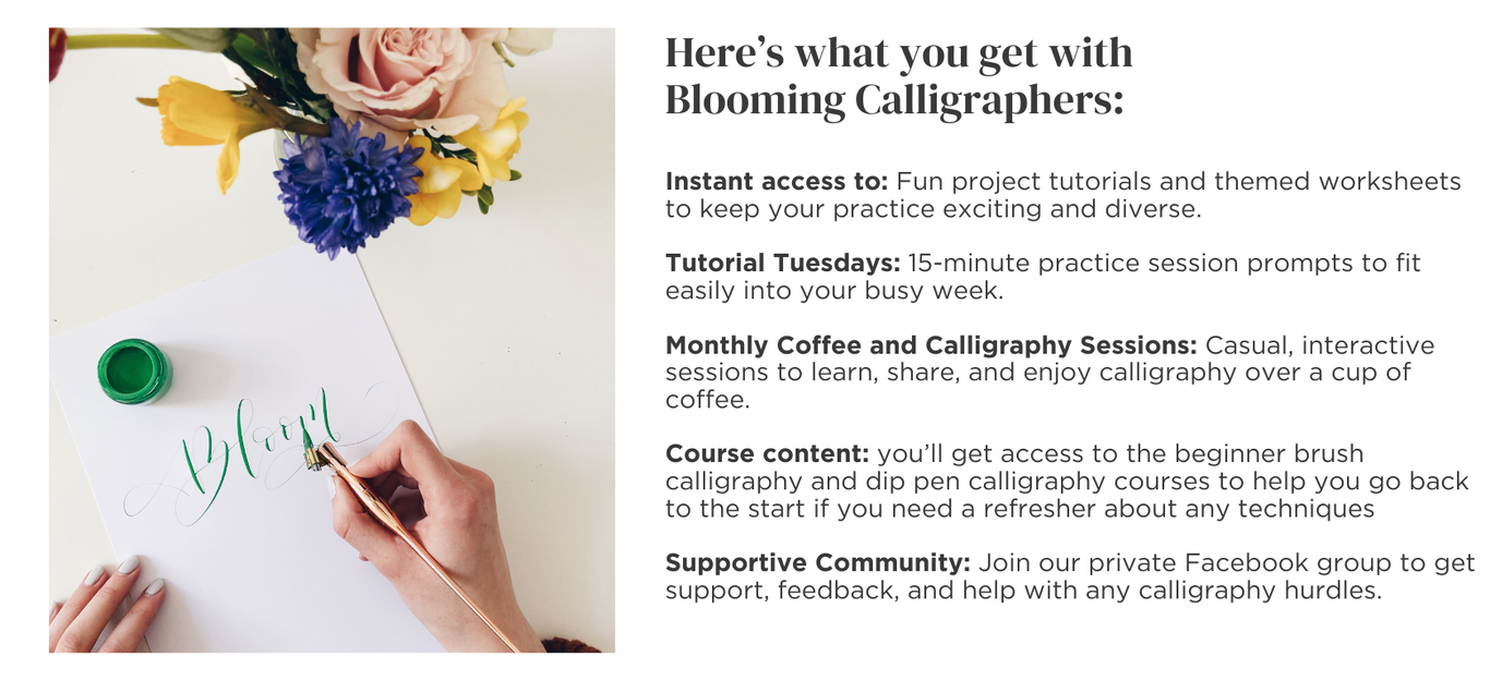 One of my Blooming Calligraphers' favourite membership perks is our Tutorial Tuesday videos! Every Tuesday, I share a short, focused, and super-specific tutorial to help you improve your skills in a fun and practical way.