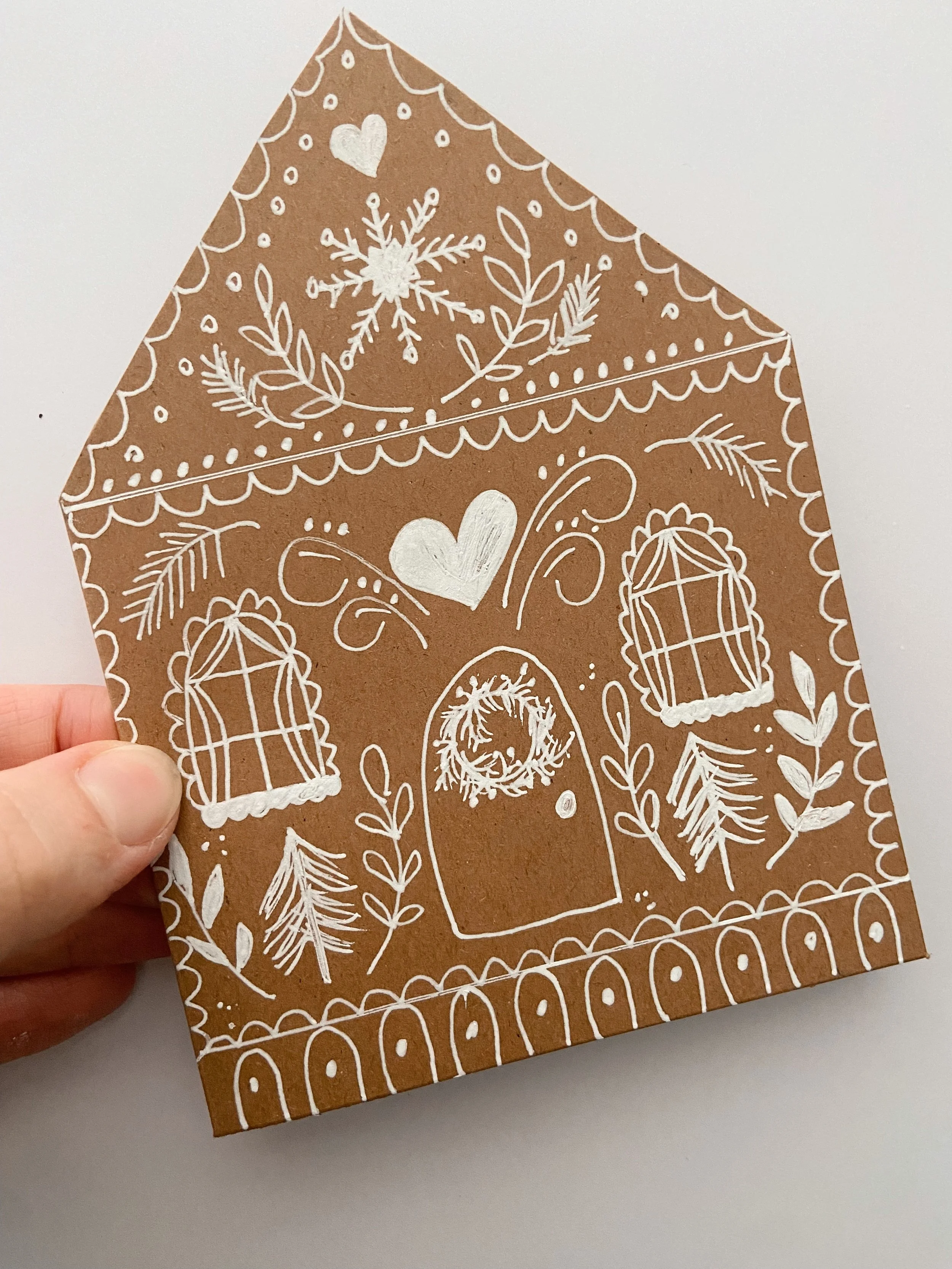 I hope you love this white pen as much as I do, it’s so beautiful an opaque. Let’s turn this simple kraft card into a gingerbread house!